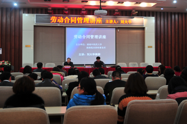 2 月 27 日下午,我校法律顾问、湖南锐杰律师事务所主任刘大华律师为全校 200 余名领导干部作了一堂翔实生动的劳动合同管理讲座。