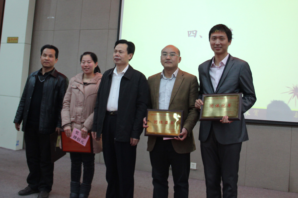 大学党委副书记、副校长黄政德给获团体奖项的学院颁奖 大学副校长葛金文给获个人综合奖项的选手颁奖 4 月 25 日下午,我校第二届辅导员职业技能竞赛颁奖典礼在国际教育学院报告厅举行。